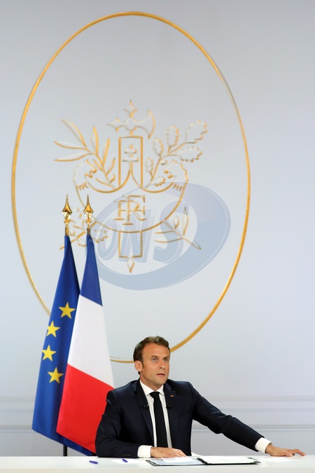 Emmanuel Macron podczas konferencji w Palacu Elizejskim