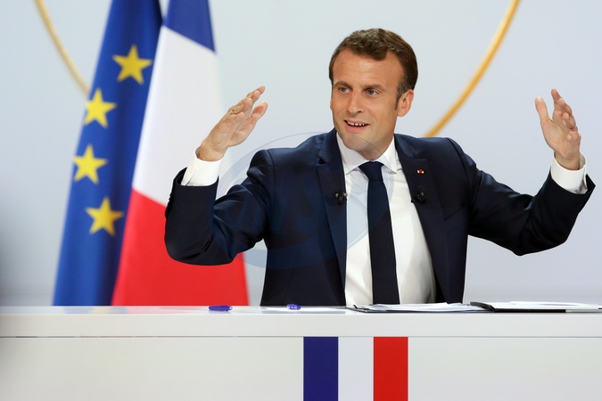 Emmanuel Macron podczas konferencji w Palacu Elizejskim