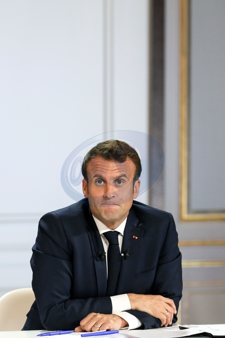 Emmanuel Macron podczas konferencji w Palacu Elizejskim