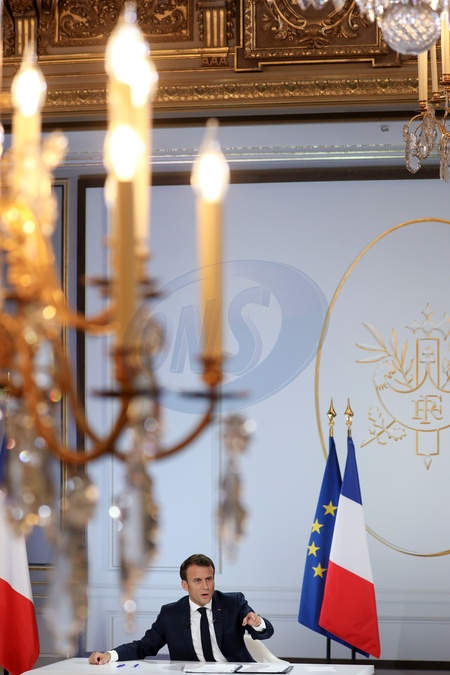 Emmanuel Macron podczas konferencji w Palacu Elizejskim