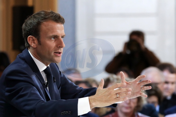 Emmanuel Macron podczas konferencji w Palacu Elizejskim