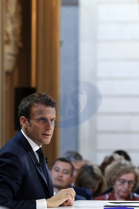 Emmanuel Macron podczas konferencji w Palacu Elizejskim