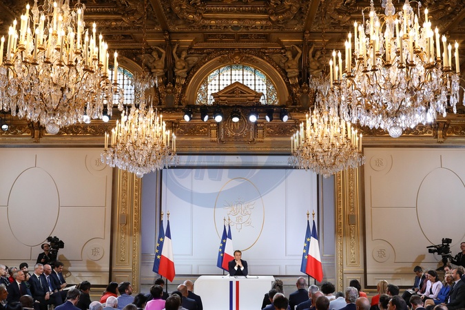 Emmanuel Macron podczas konferencji w Palacu Elizejskim