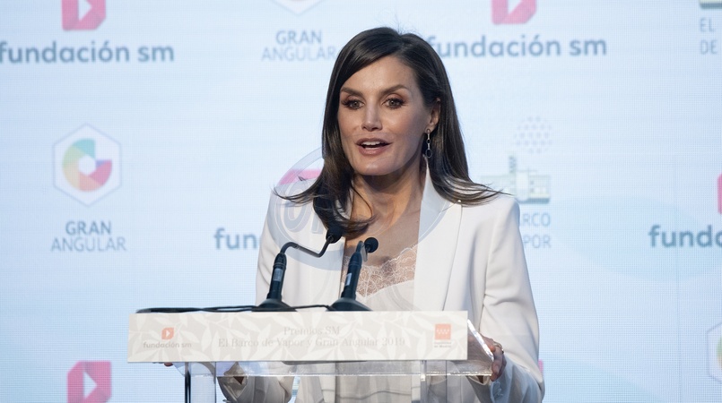Krolowa Letizia bialej marynarce na wreczeniu nagrod 'El Barco de Vapor