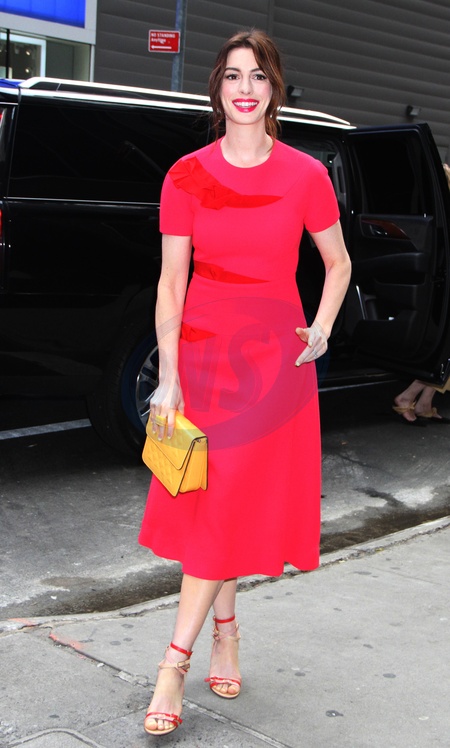 Anne Hathaway w czerwonej sukience w Good Morning America