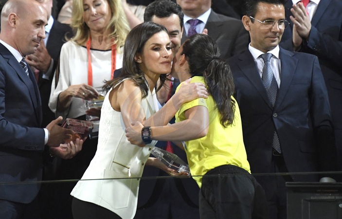 Krolowa Letizia w bialej kamizelce na finale meczu 'Queens Cup' women football
