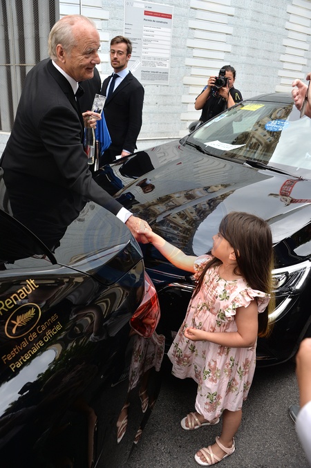 Cannes - Bill Murray ze szklanka i z butelka wody wita sie z mala dziewczynka