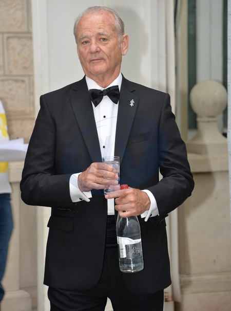 Cannes - Bill Murray ze szklanka i z butelka wody wita sie z mala dziewczynka