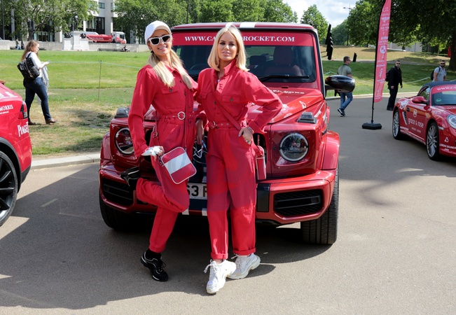 Paris Hilton w czerwonym kombinezonie na Cash & Rocket charity tour departure