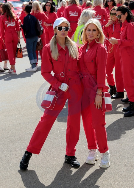 Paris Hilton w czerwonym kombinezonie na Cash & Rocket charity tour departure