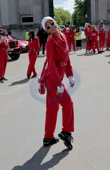 Paris Hilton w czerwonym kombinezonie na Cash & Rocket charity tour departure