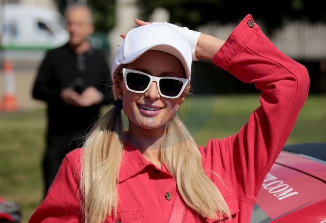 Paris Hilton w czerwonym kombinezonie na Cash & Rocket charity tour departure