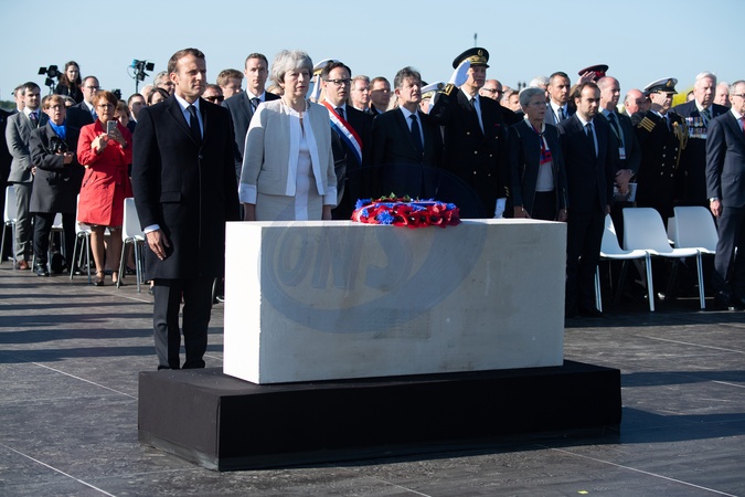 Macron i May na obchodach 75. rocznicy ladowania w Normandii