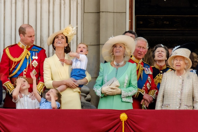 Ksiaze William, ksiezna Kate, Jerzy, Louis, ksiezniczka Charlotte, Camilla, Karol, Anna, krolowa Elzbieta