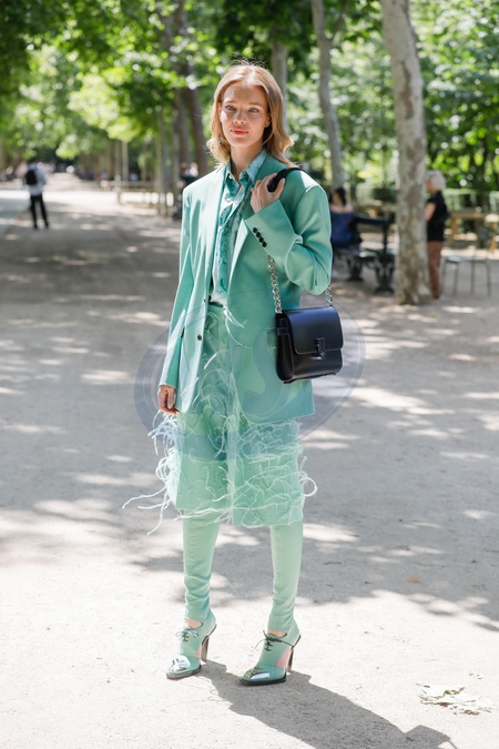 Natalia Vodianova w spodniach z piorami przed pokazem Berluti