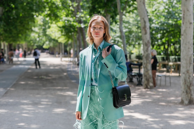 Natalia Vodianova w spodniach z piorami przed pokazem Berluti