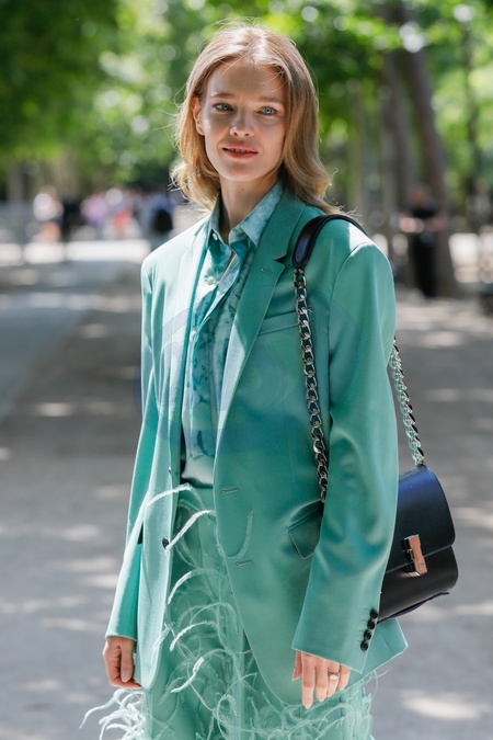 Natalia Vodianova w spodniach z piorami przed pokazem Berluti