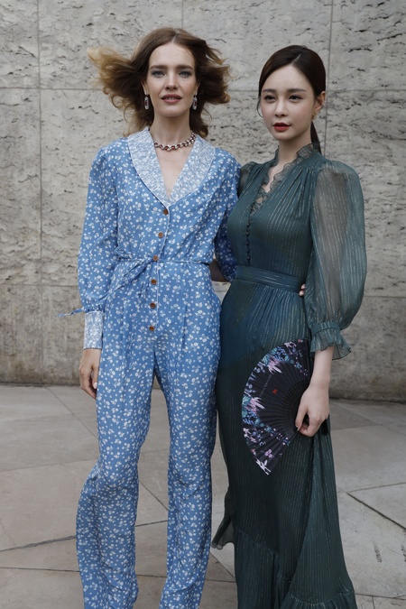 Natalia Vodianova w niebieskim kombinezonie na Ulyanna Sergeenko - Paris Haute Couture 2019