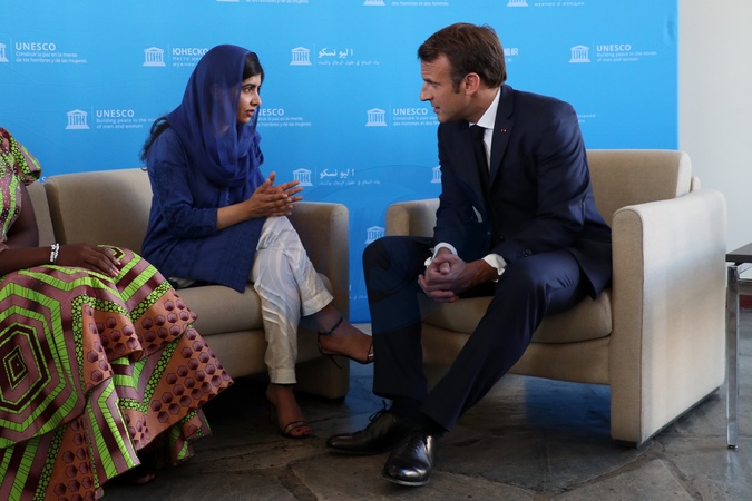 Malala Yousafzai i Emmanuel Macron w siedzibie UNESCO