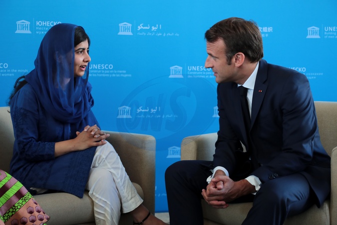 Malala Yousafzai i Emmanuel Macron w siedzibie UNESCO