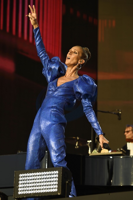 Celine Dion w niebieskim kombinezonie na British Summertime 2019