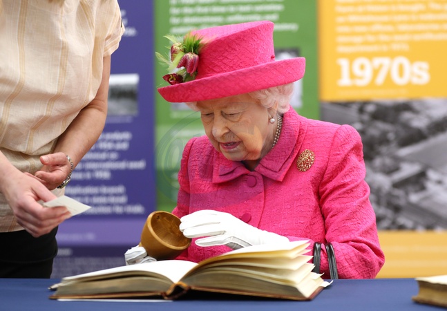 Krolowa Elzbieta II na rozowo w National Institute of Agricultural Botany