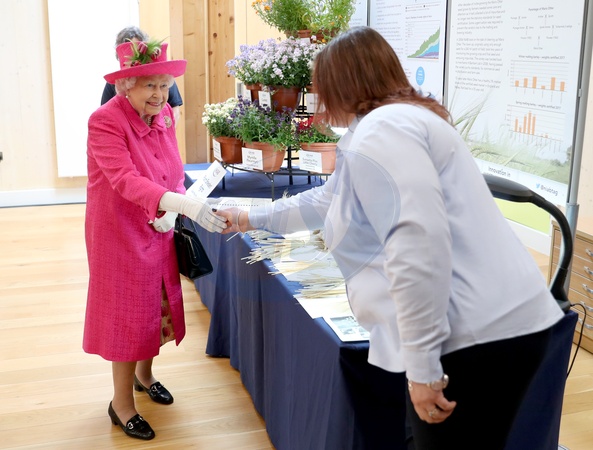Krolowa Elzbieta II na rozowo w National Institute of Agricultural Botany