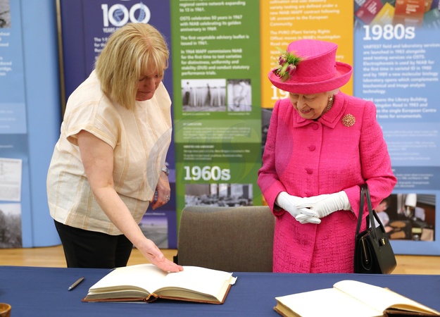 Krolowa Elzbieta II na rozowo w National Institute of Agricultural Botany