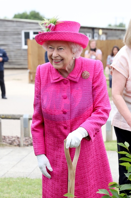 Krolowa Elzbieta II na rozowo w National Institute of Agricultural Botany