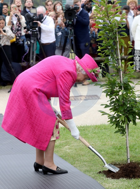 Krolowa Elzbieta II na rozowo w National Institute of Agricultural Botany