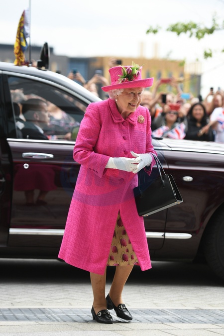 Krolowa Elzbieta II na rozowo w National Institute of Agricultural Botany