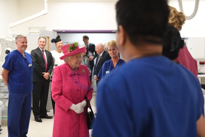 Krolowa Elzbieta II na rozowo w National Institute of Agricultural Botany