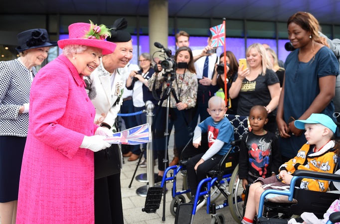 Krolowa Elzbieta II na rozowo w National Institute of Agricultural Botany