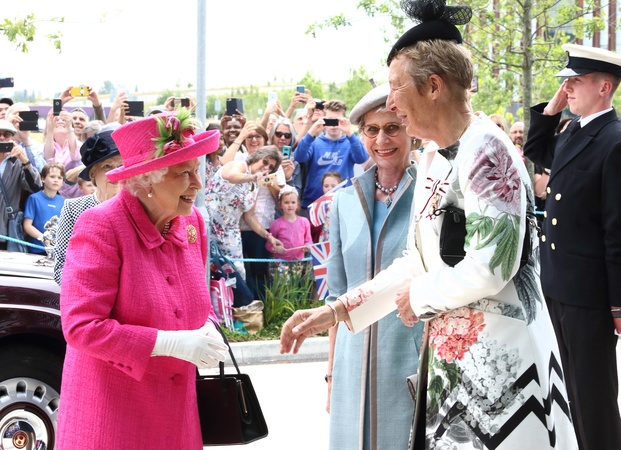 Krolowa Elzbieta II na rozowo w National Institute of Agricultural Botany