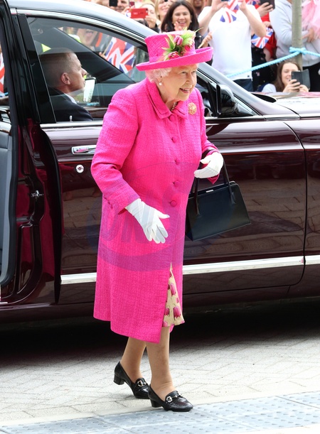 Krolowa Elzbieta II na rozowo w National Institute of Agricultural Botany