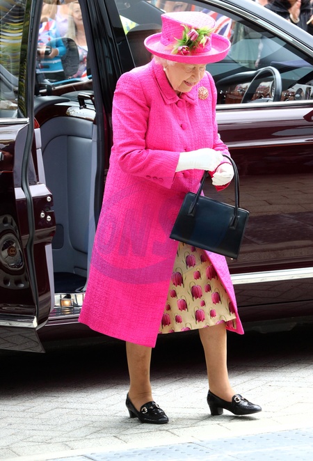 Krolowa Elzbieta II na rozowo w National Institute of Agricultural Botany
