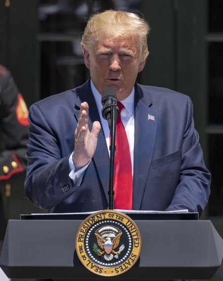 Donald J. Trump przemawia na 3. dorocznej wystawie produktow w Bialym Domu