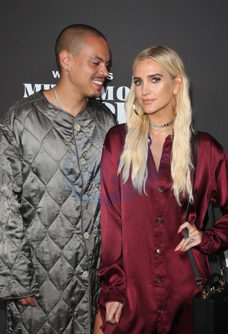 Ashlee Simpson w bordowej koszuli i jej maz w plaszczu na imprezie