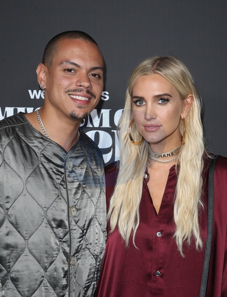 Ashlee Simpson w bordowej koszuli i jej maz w plaszczu na imprezie