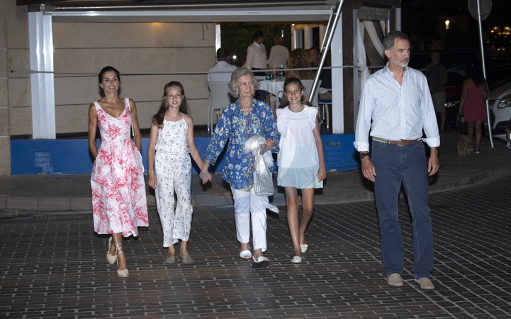 Krol Filip z zona, corkami i matka ida do restauracji Ola de Mar