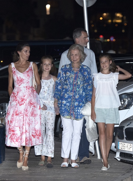 Krol Filip z zona, corkami i matka ida do restauracji Ola de Mar