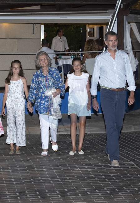 Krol Filip z zona, corkami i matka ida do restauracji Ola de Mar