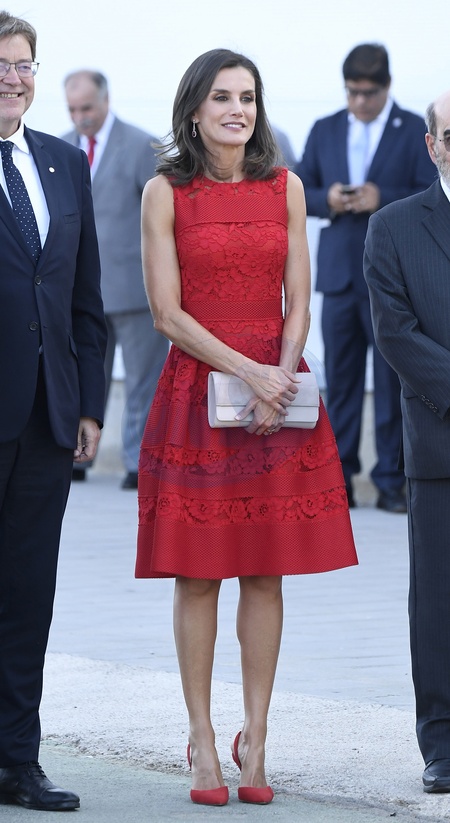 Krolowa Letizia w czerwonej sukience na inauguracji Swiatowego Centrum Zrownowazonej Zywnosci Miejskiej w Walencji