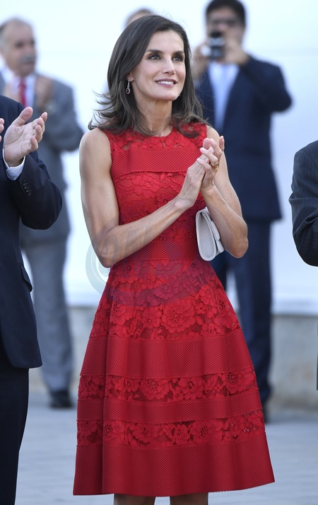 Krolowa Letizia w czerwonej sukience na inauguracji Swiatowego Centrum Zrownowazonej Zywnosci Miejskiej w Walencji
