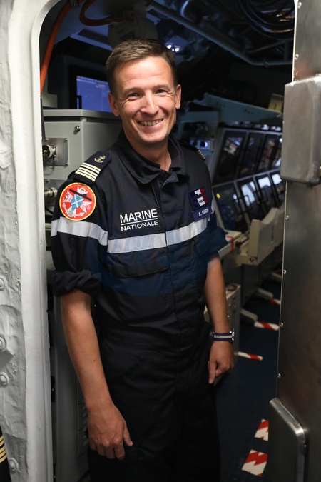 Emmanuel Macron w kasku na nowym okrecie podwodnym Suffren w Cherbourg