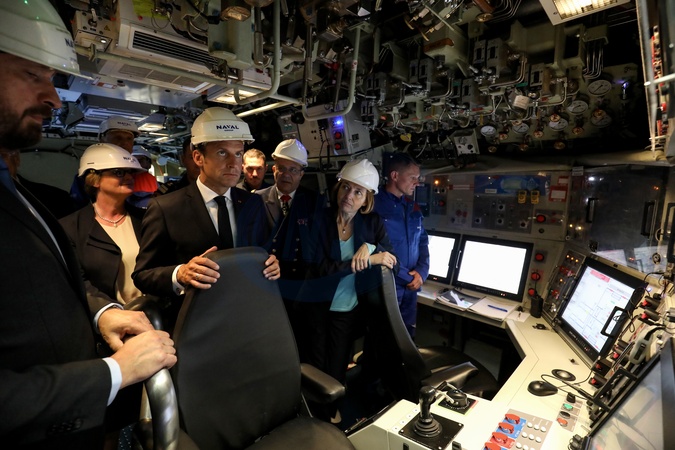 Emmanuel Macron w kasku na nowym okrecie podwodnym Suffren w Cherbourg