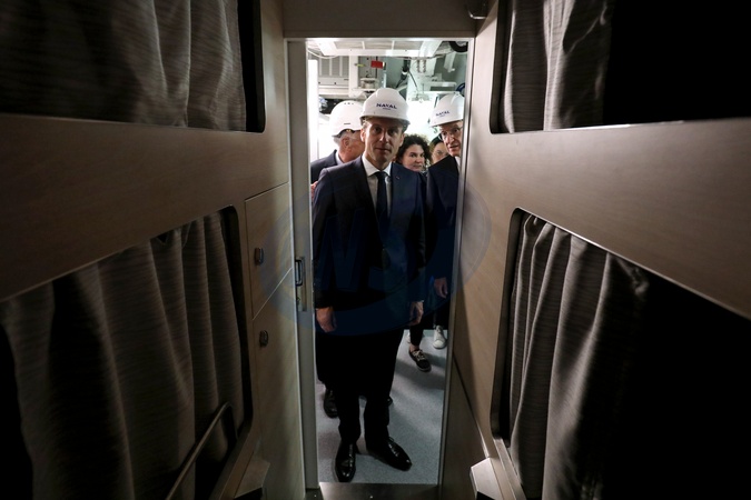Emmanuel Macron w kasku na nowym okrecie podwodnym Suffren w Cherbourg