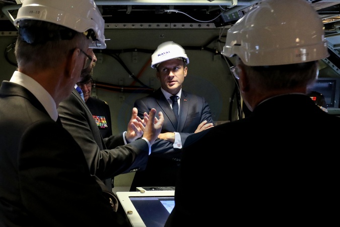 Emmanuel Macron w kasku na nowym okrecie podwodnym Suffren w Cherbourg
