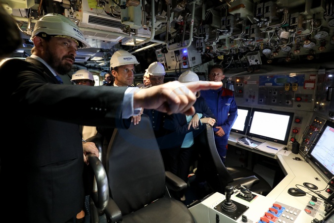 Emmanuel Macron w kasku na nowym okrecie podwodnym Suffren w Cherbourg