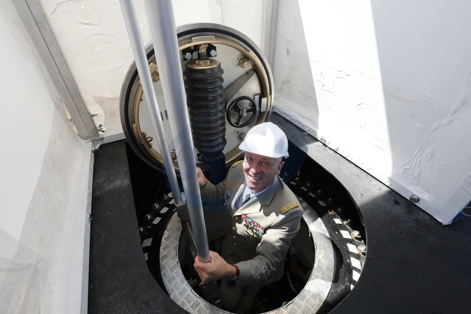 Emmanuel Macron w kasku na nowym okrecie podwodnym Suffren w Cherbourg